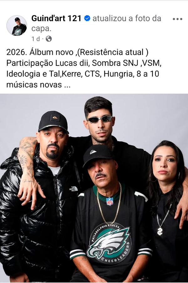Um dos maiores grupos de rap do Distrito Federal, Guind’art 121, deixou seus fãs com grandes expectativas para o ano de 2026. Isso porque o icônico grupo de Brasília fez uma postagem em suas redes sociais na qual informa o lançamento e um novo álbum para o ano de 2026.